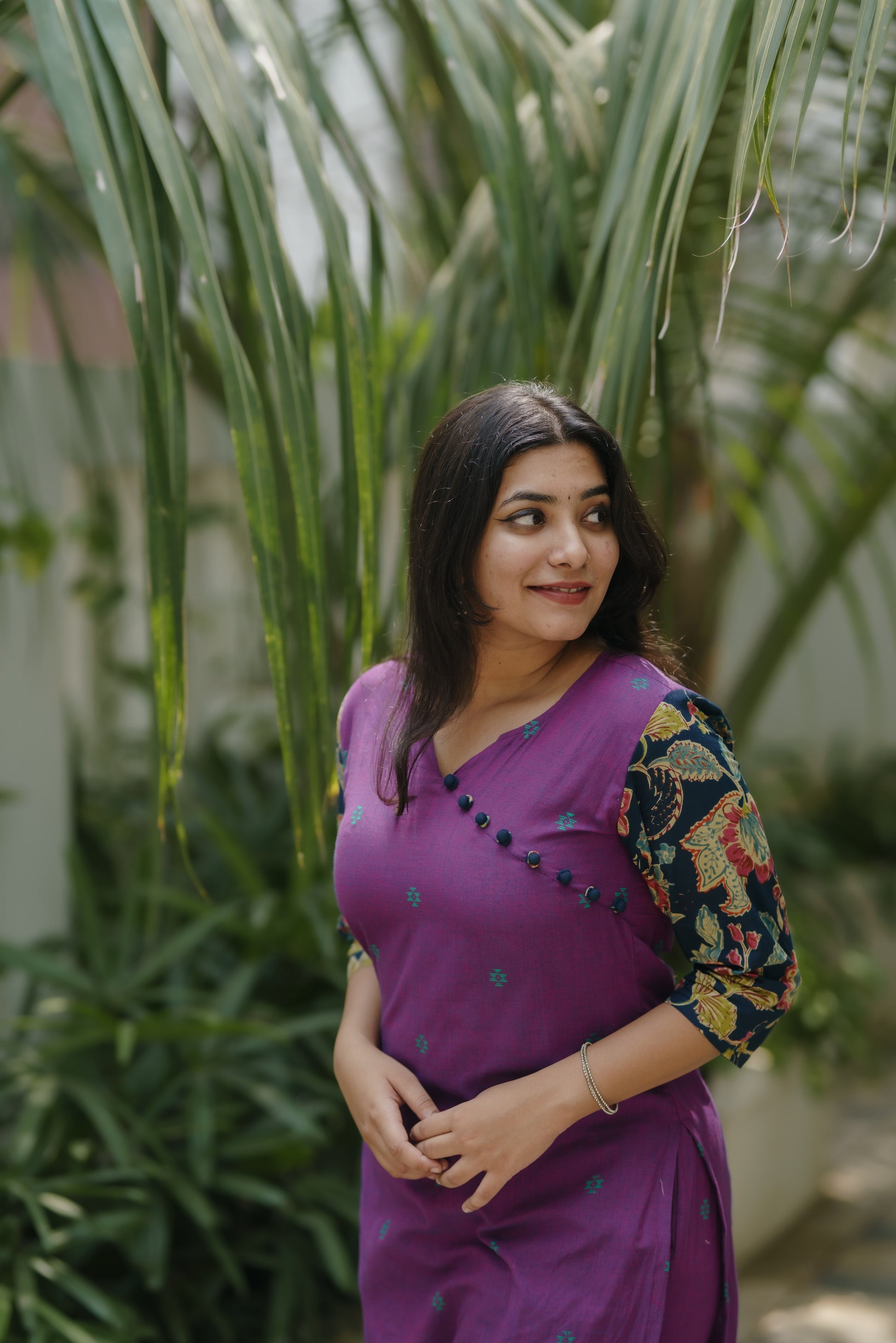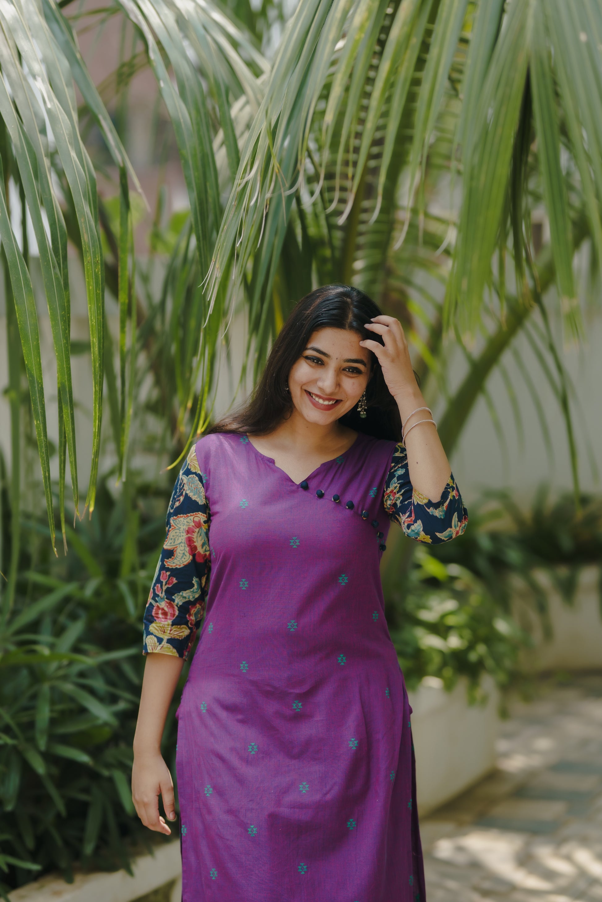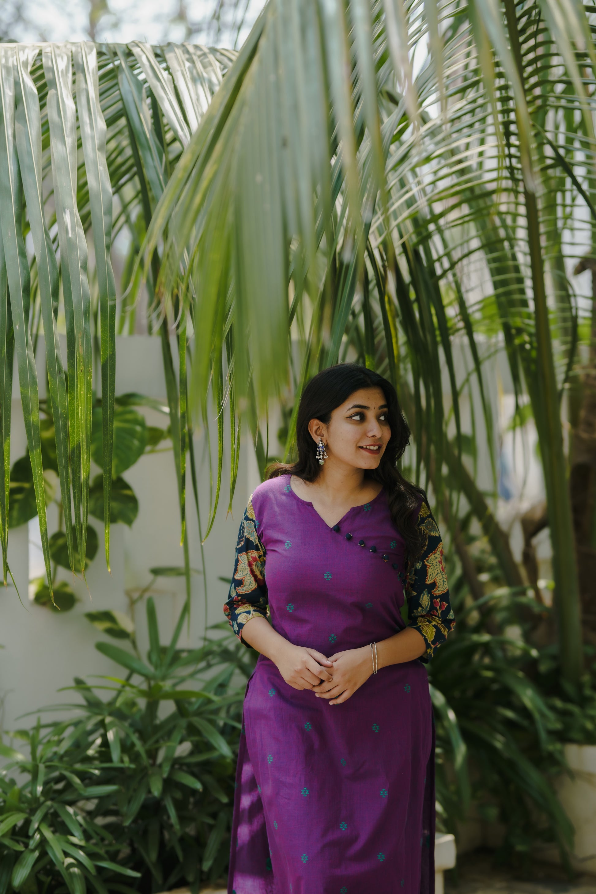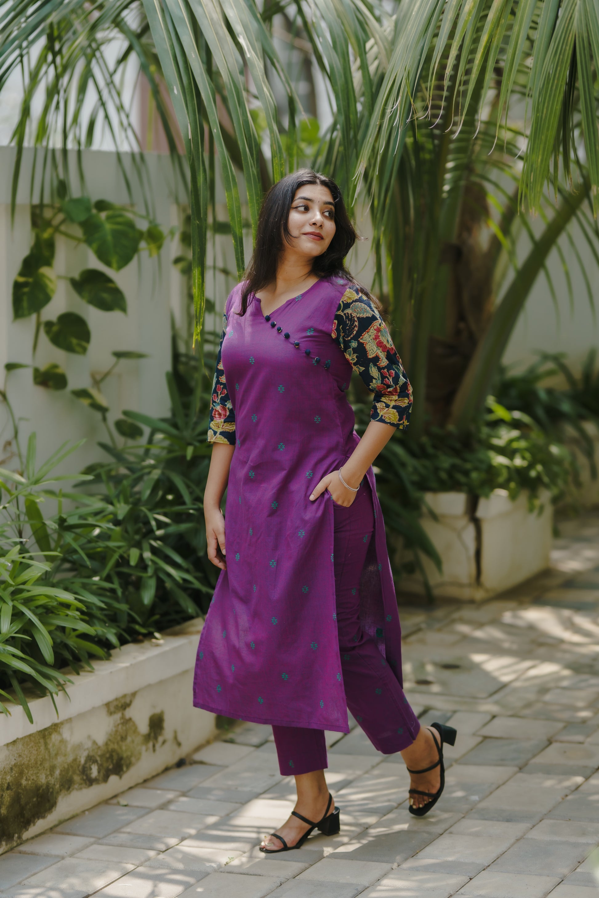 Crafted from soft handloom cotton, this vibrant purple kurta set features delicate all-over butta motifs. The contrast block print floral sleeves add a vibrant touch, while potli button detailing lends a classic Indian charm. Lightweight and breathable, it's the perfect choice for work, college, or effortless everyday wear.