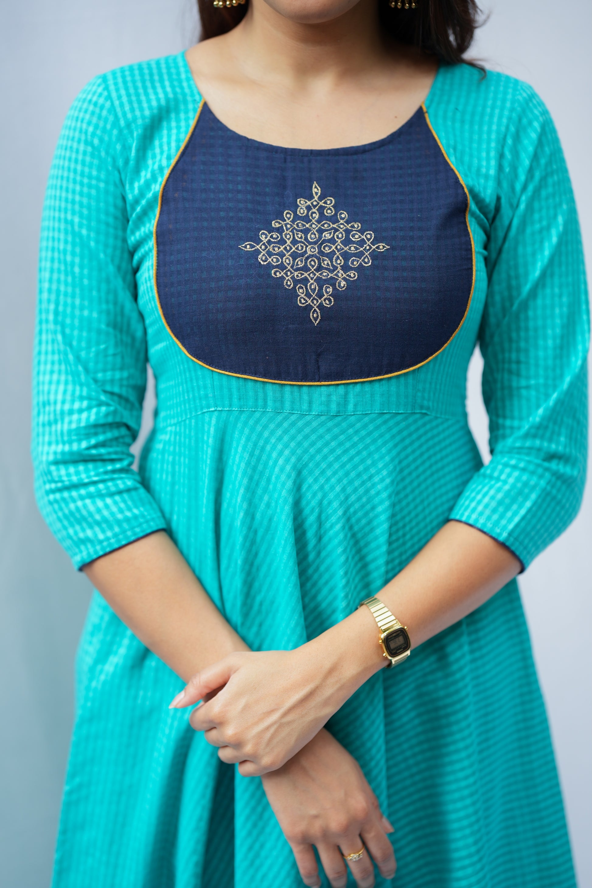 A beautiful teal anarkali kurta featuring delicate self-checks and stunning golden kolam embroidery. The navy blue contrast patch brings a fresh twist to this classic silhouette, while the matching pants create a perfectly coordinated look. A thoughtfully crafted ethnic outfit that makes a graceful statement.