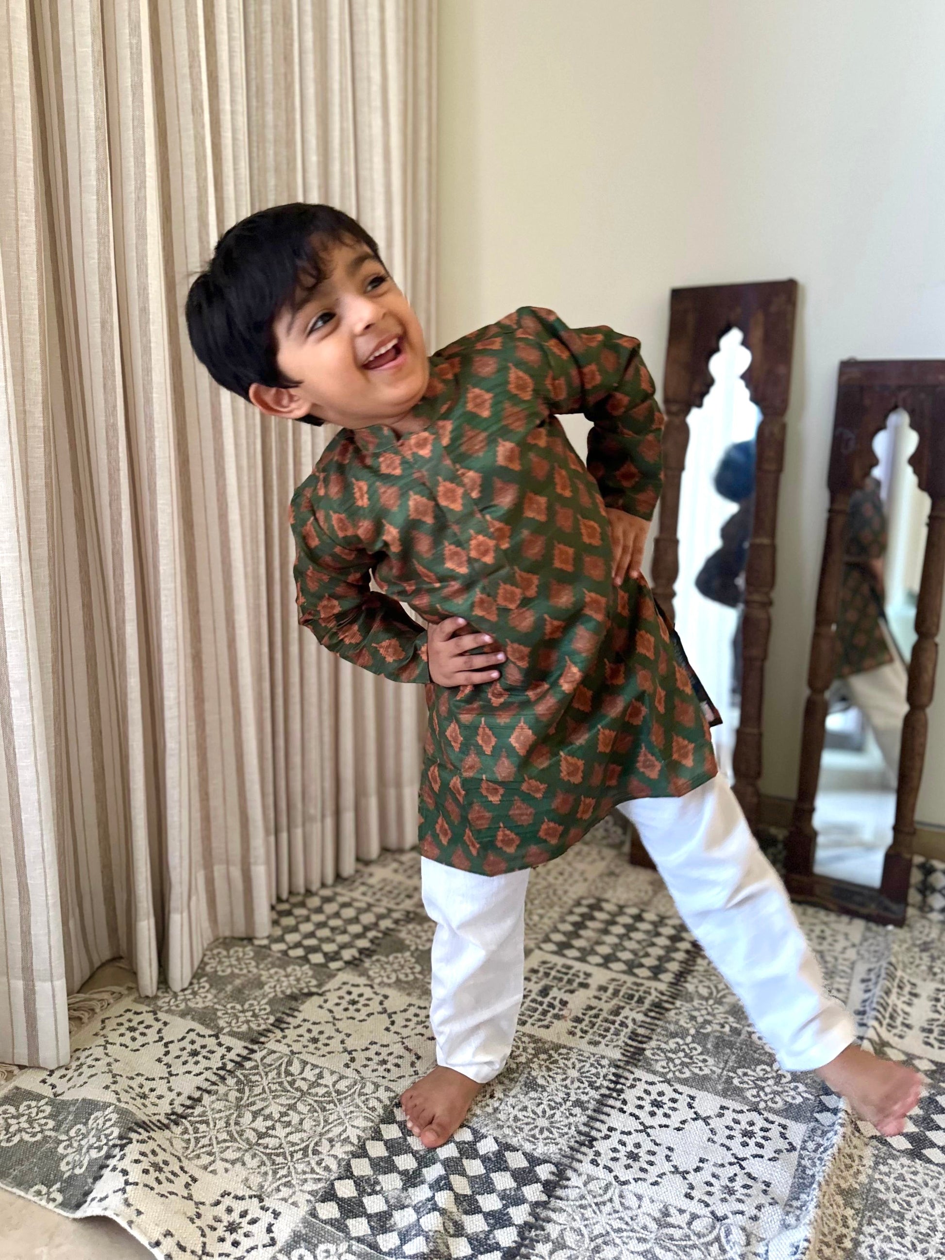 Green Ikat kurta in Tussar silk with off-white mul cotton pants. A smart 2-piece ethnic set for your little prince! Lining provided.