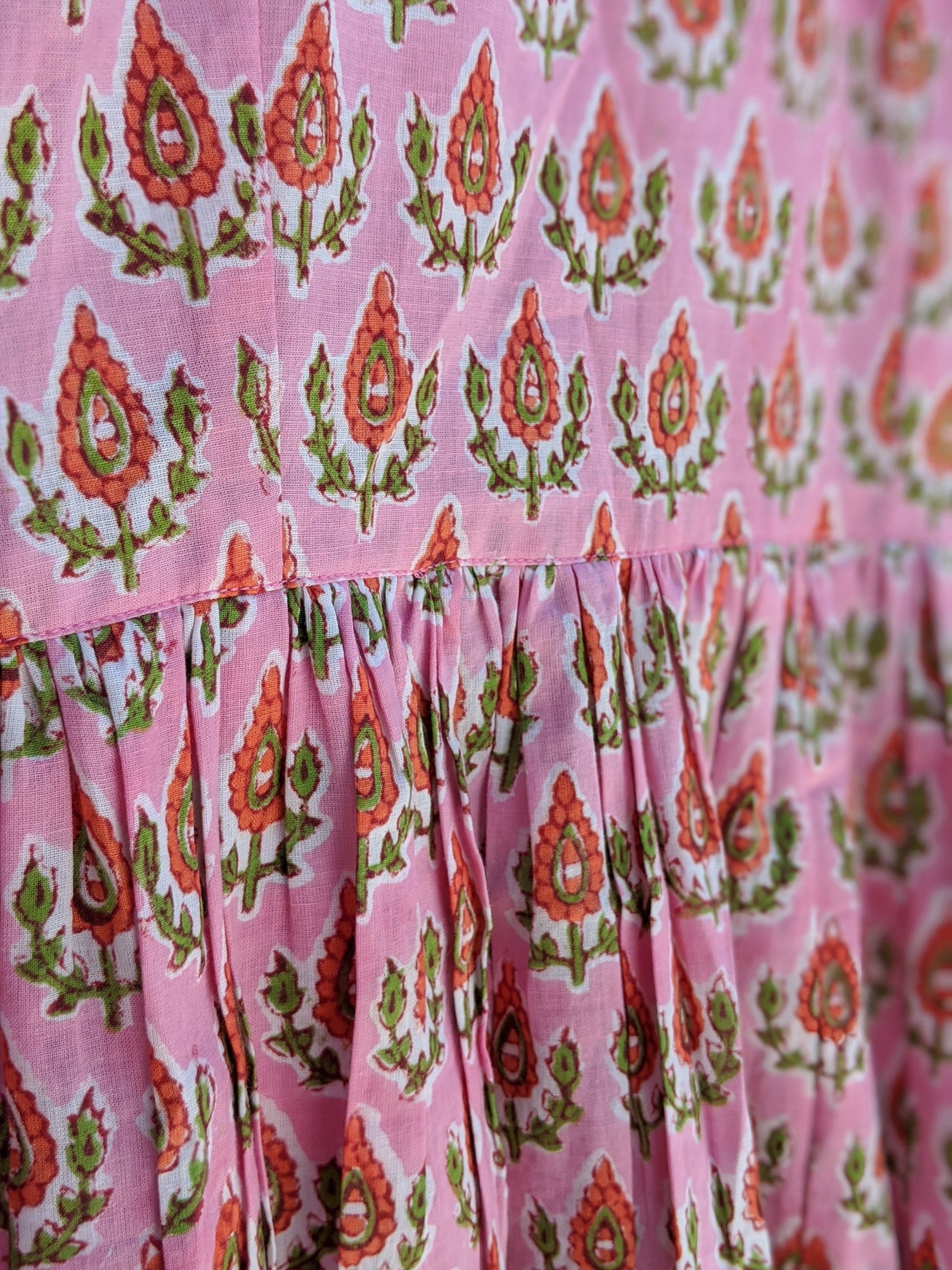 Casual and comfortable hand block printed midi dress with 3/4 sleeves and side pockets.
