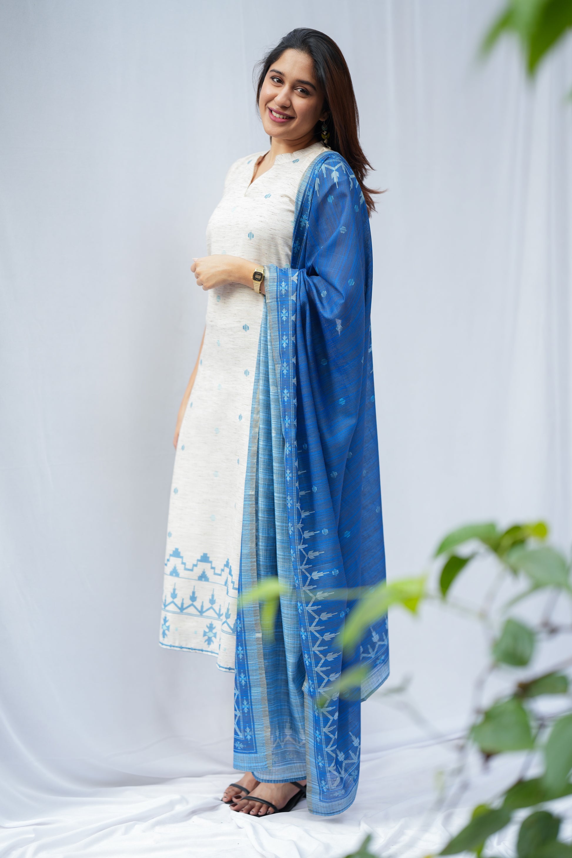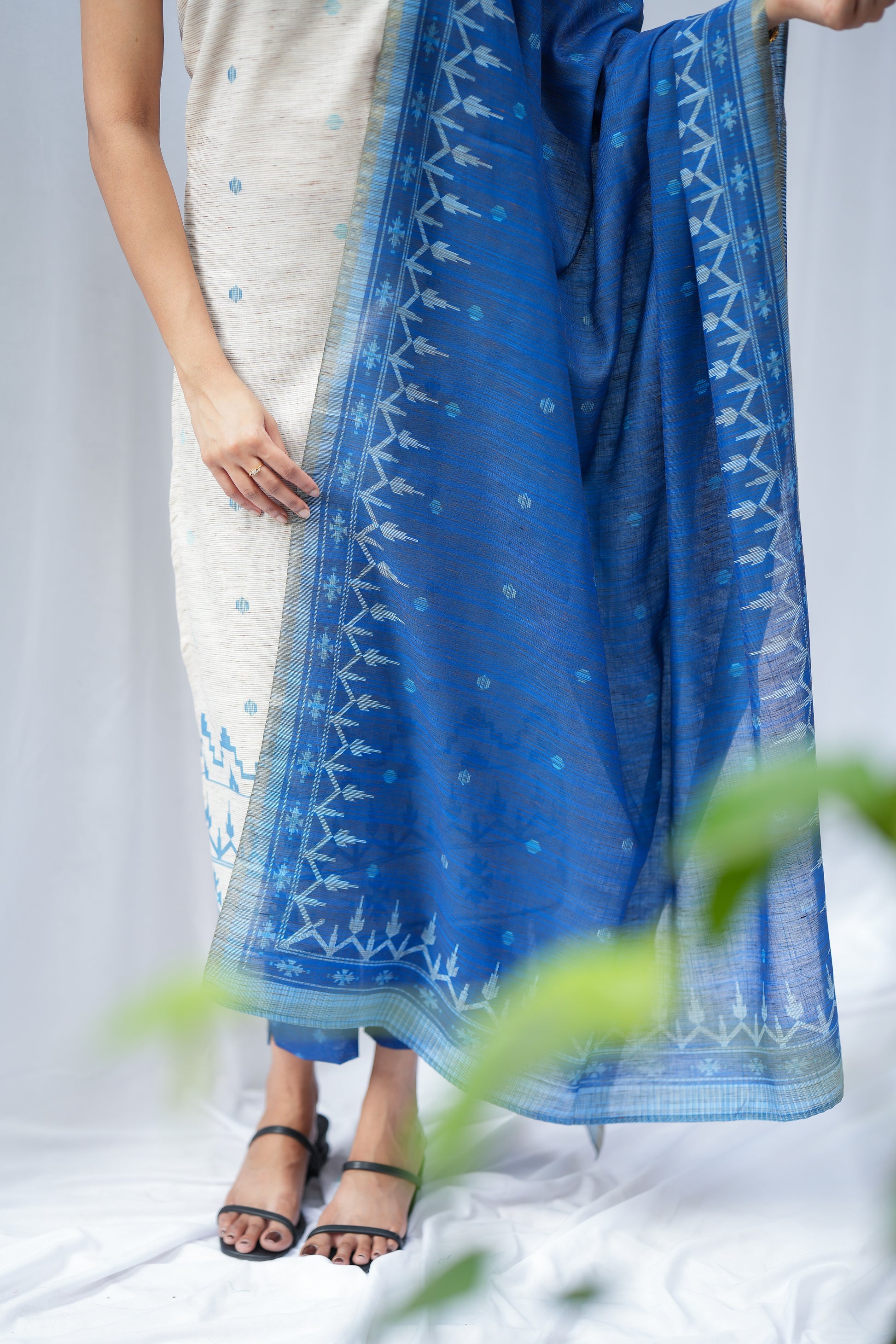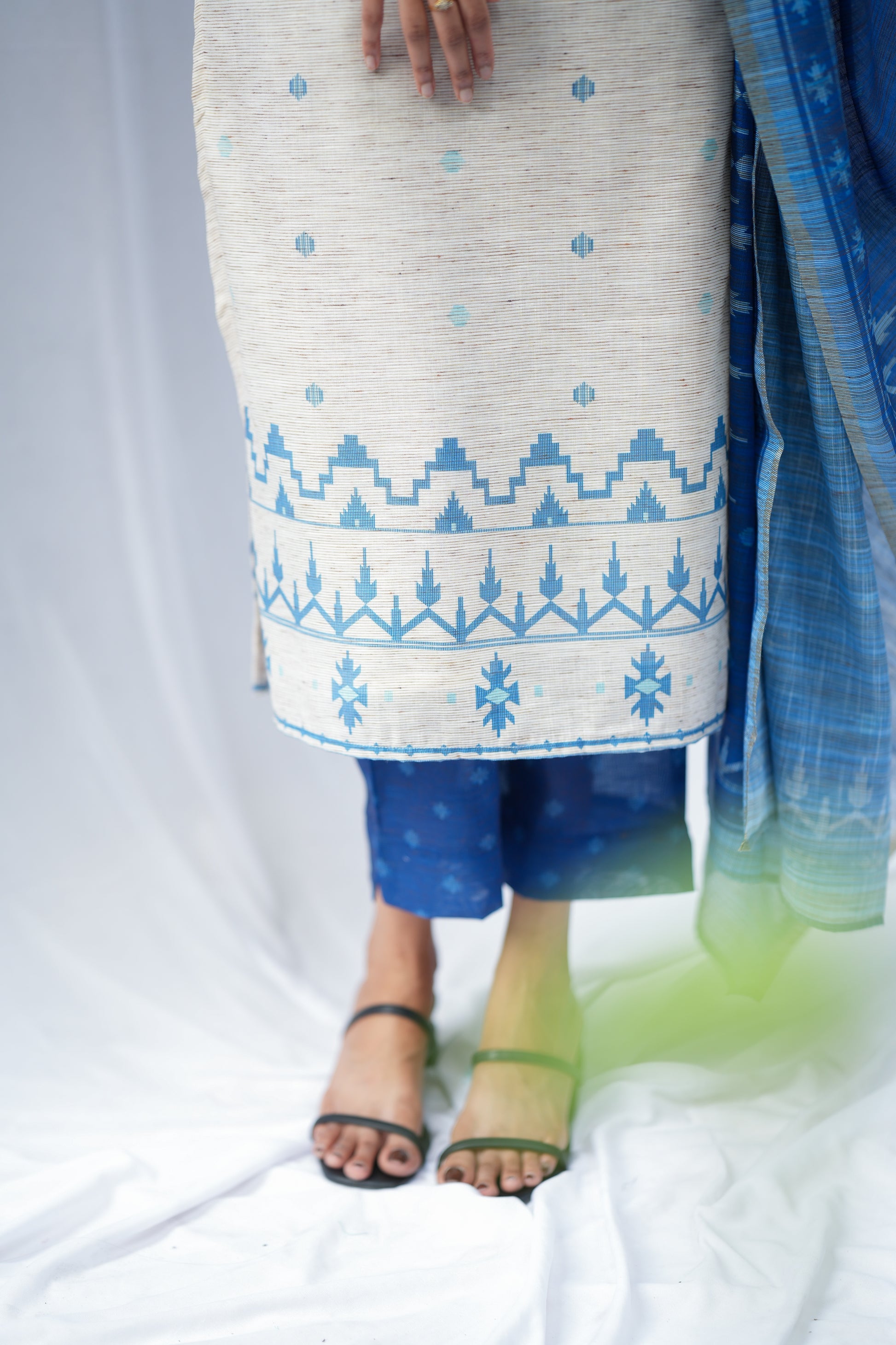 Crafted from handloom fabric, this Jamdani set features a smart collar beige kurta paired with blue pants and a beautiful blue dupatta. A comfortable ensemble perfect for any work setting. Lining included.