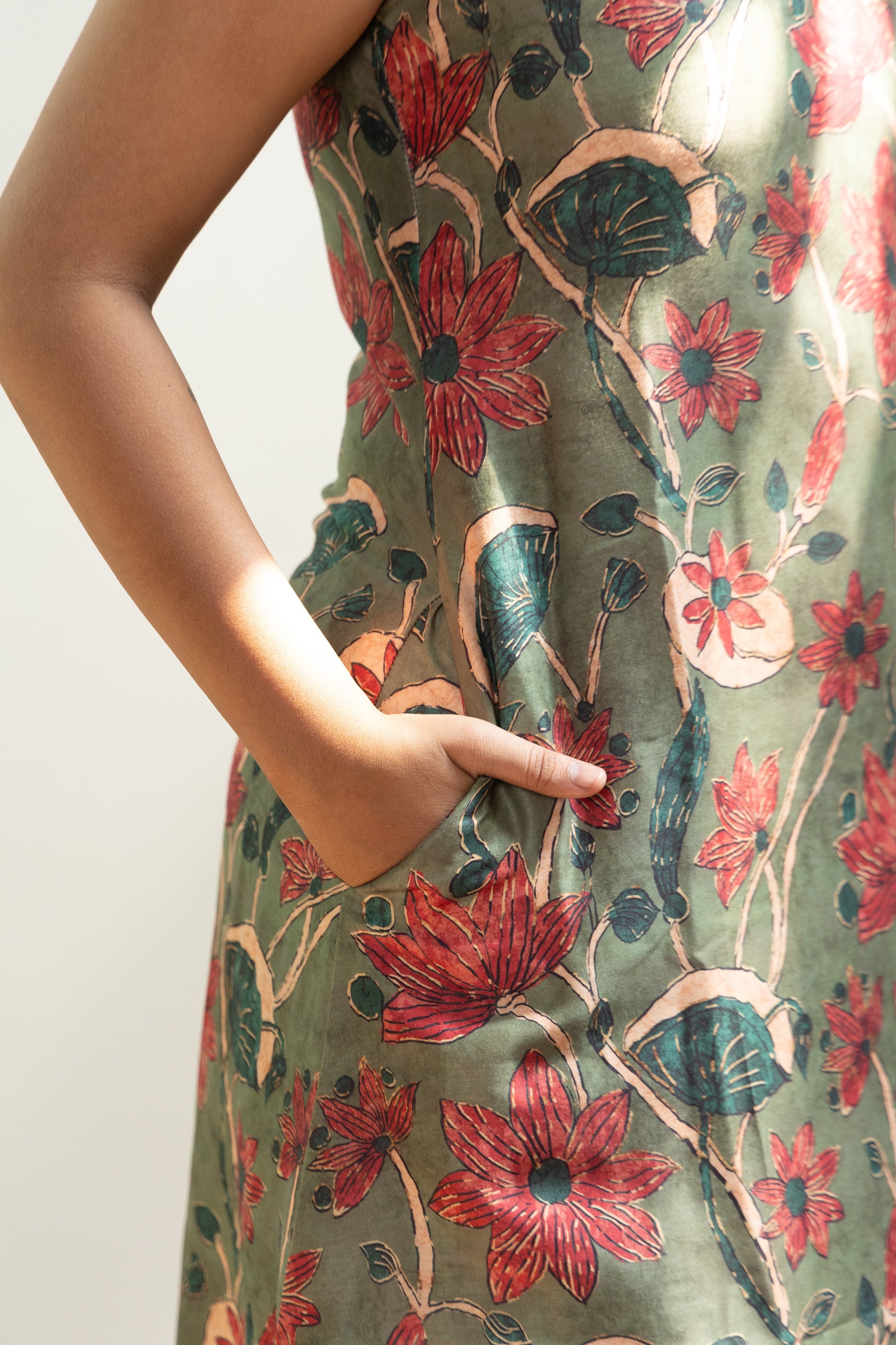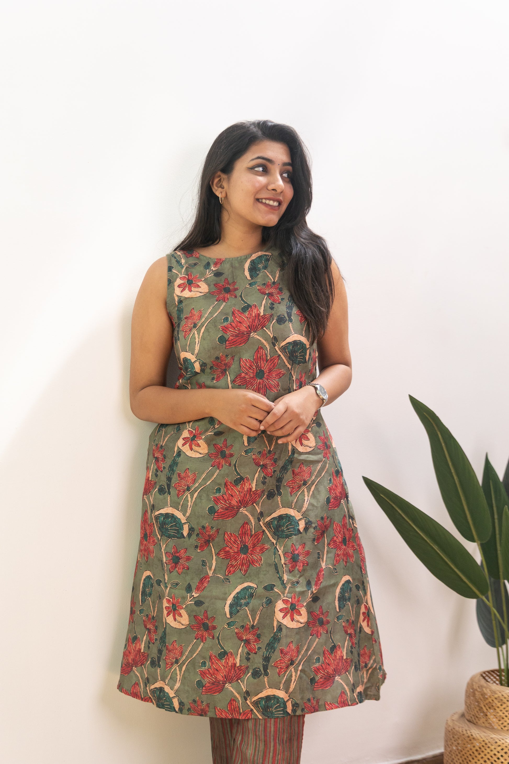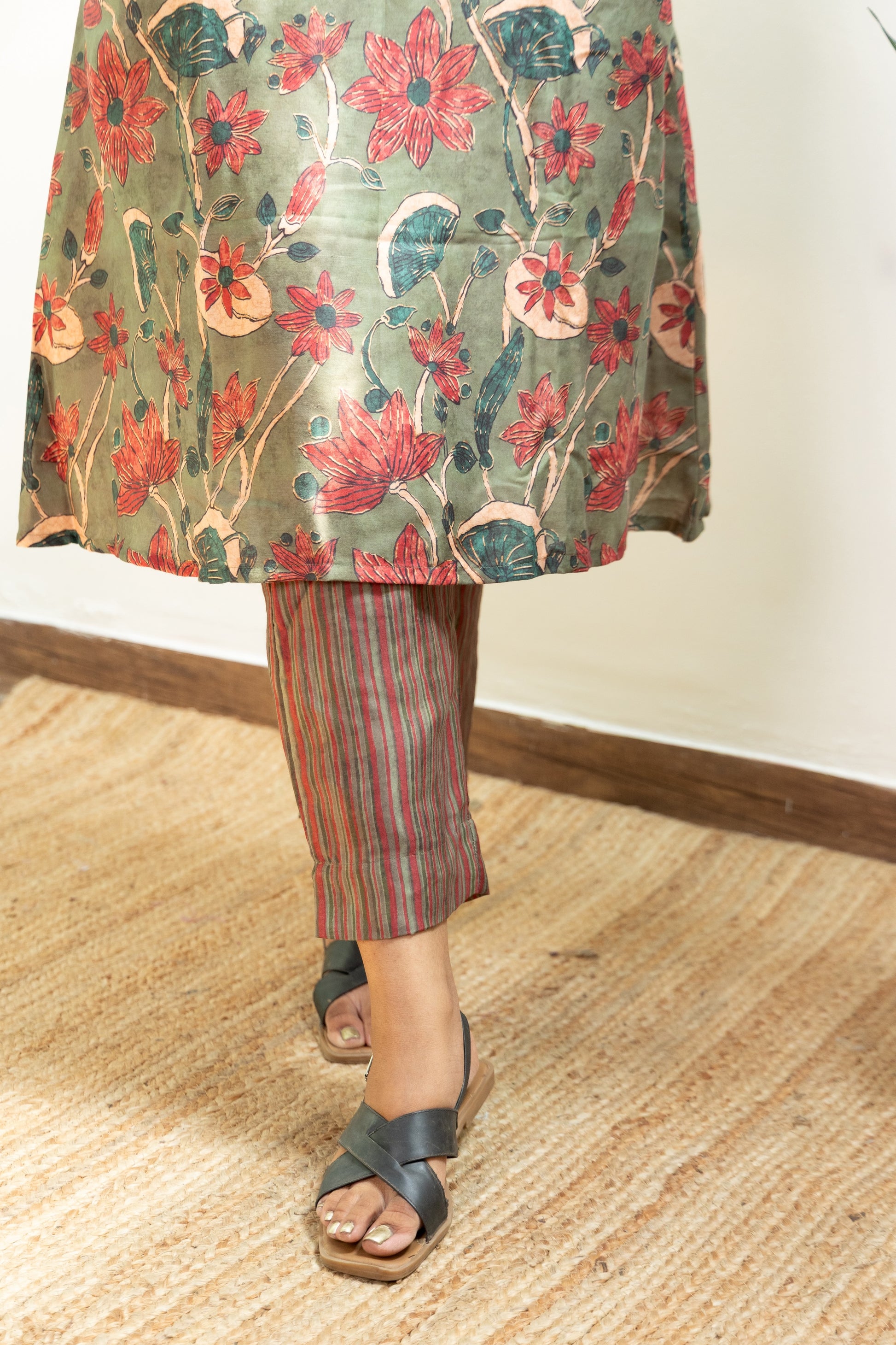 Crafted for everyday wear, this kurta set is made from soft and comfortable cotton satin material. The sleeveless floral kurta features a high neck design, while the striped pants offer a stylish contrast. Elevate your wardrobe with this elegant and versatile outfit!