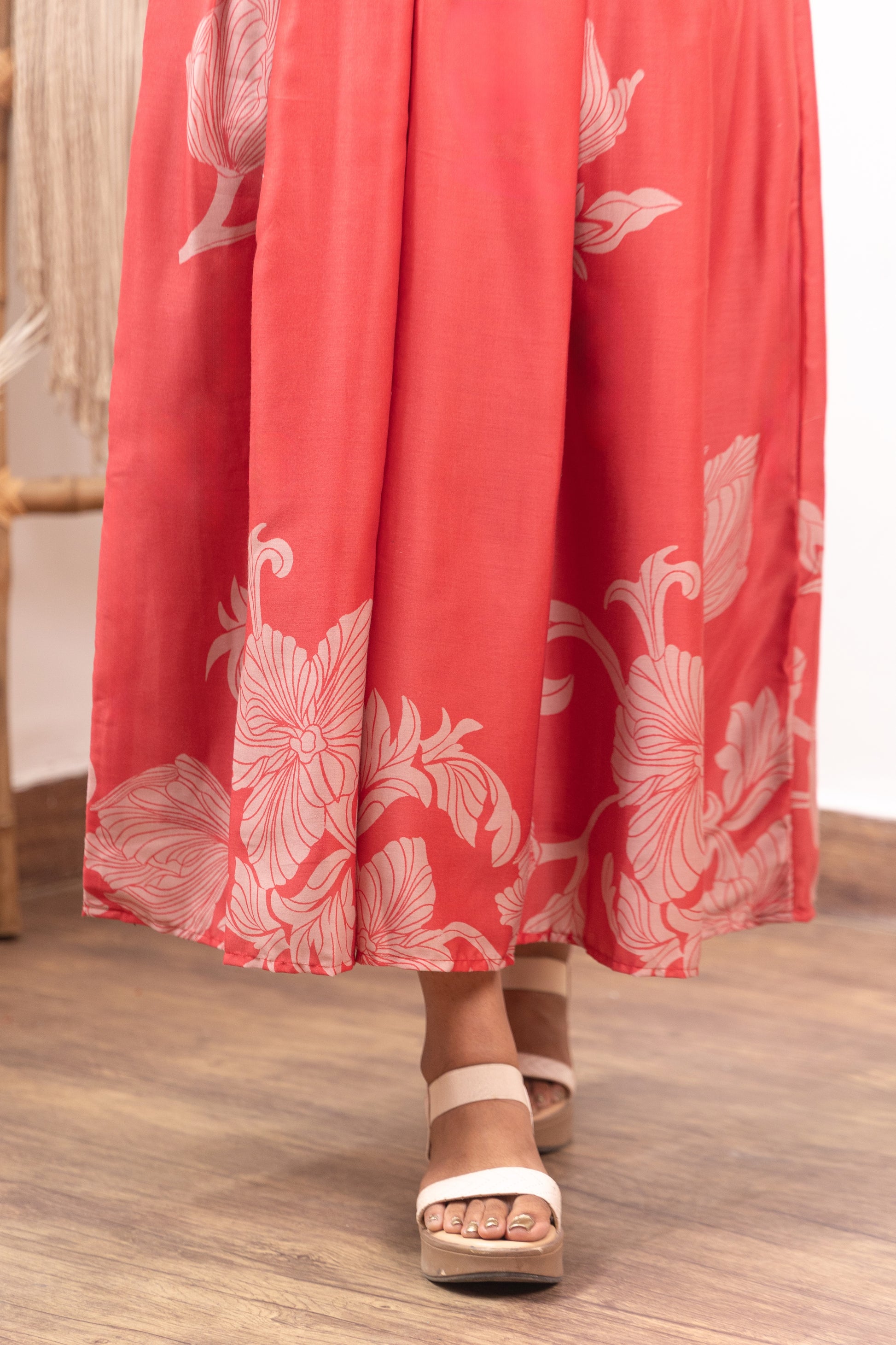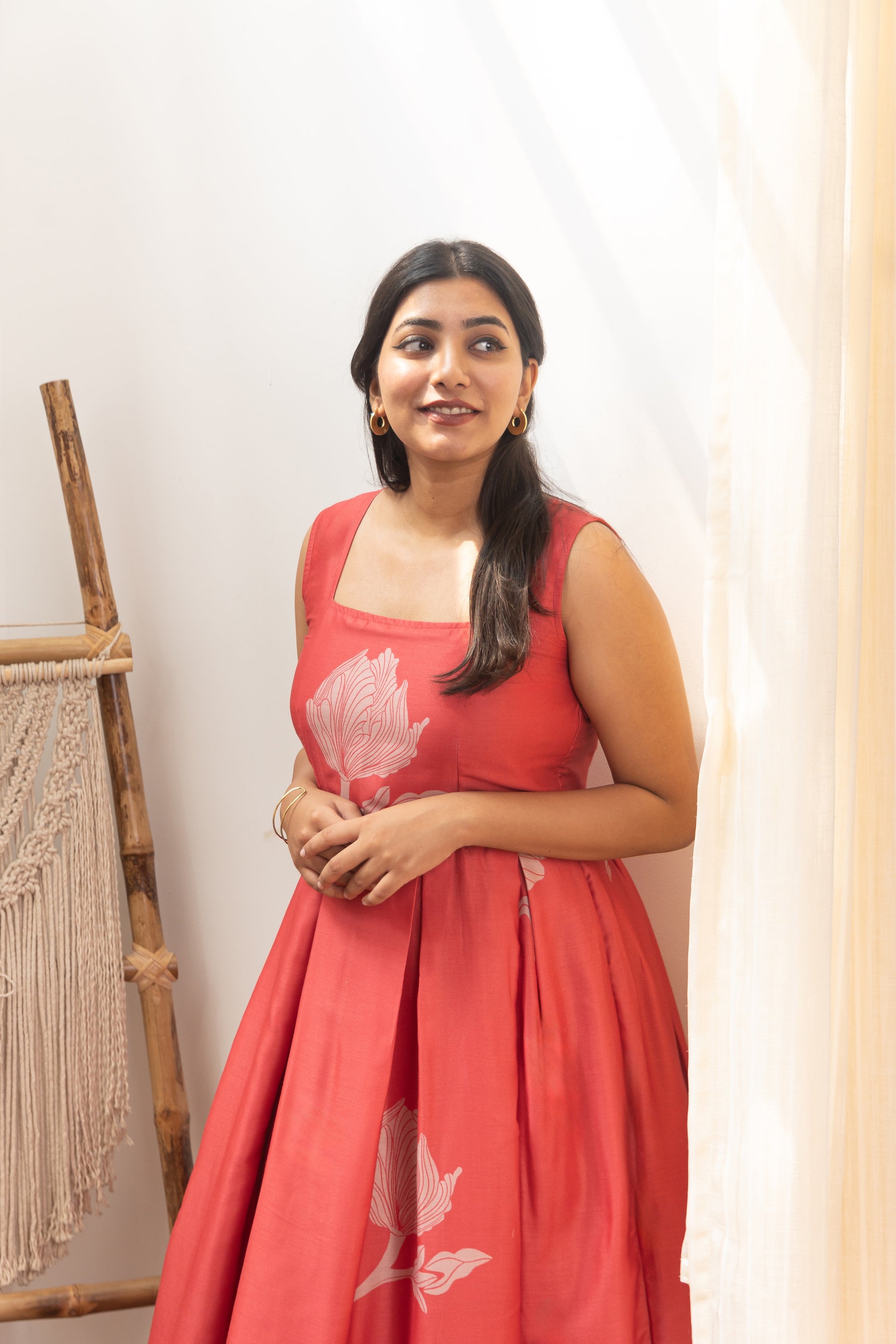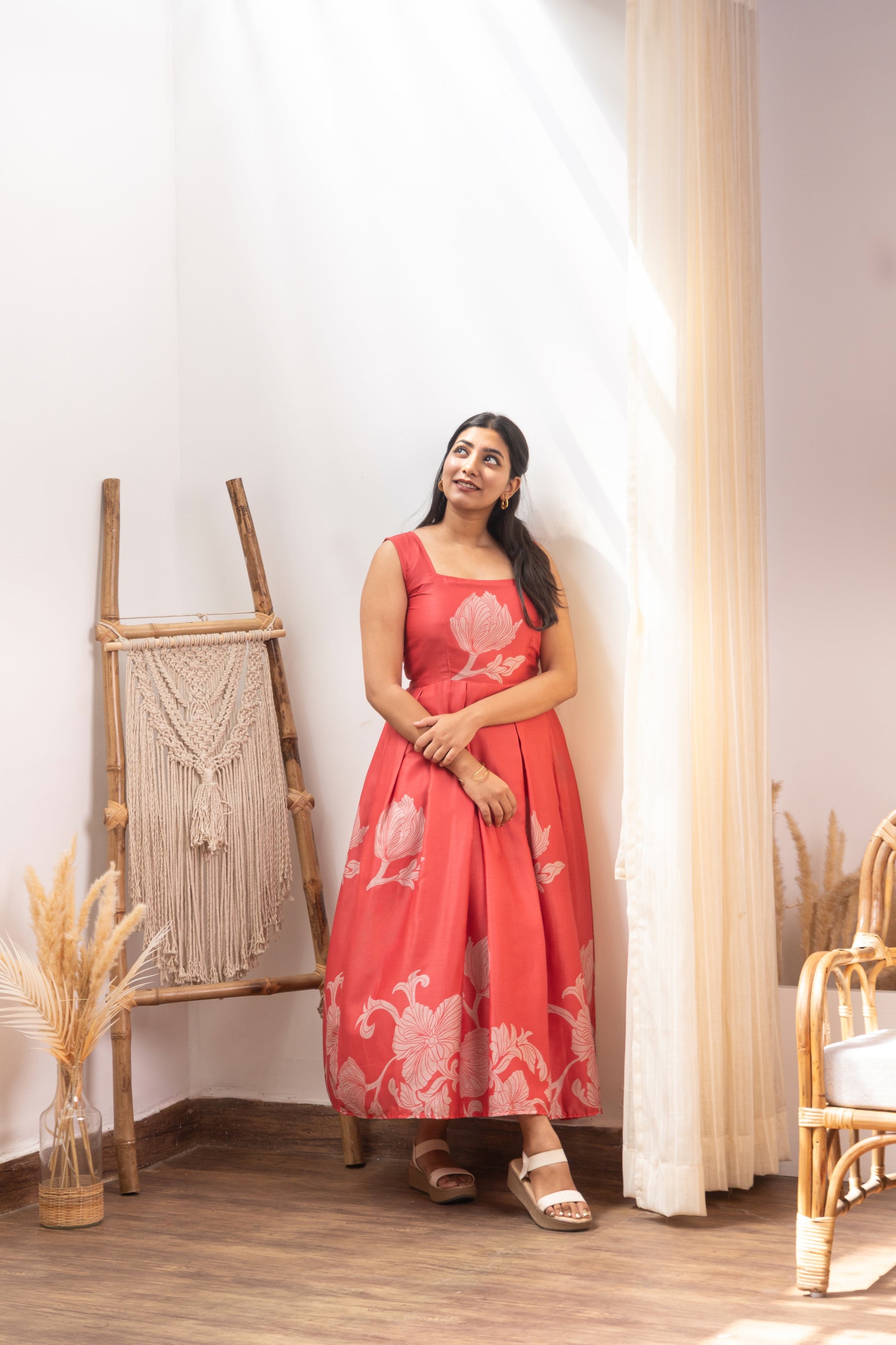 This pretty cotton satin coral floral midi dress is the perfect blend of flirty and feminine. The sleeveless design allows for a comfortable and breezy fit, while the big floral prints add a touch of vibrancy. A versatile and stylish addition to any wardrobe!