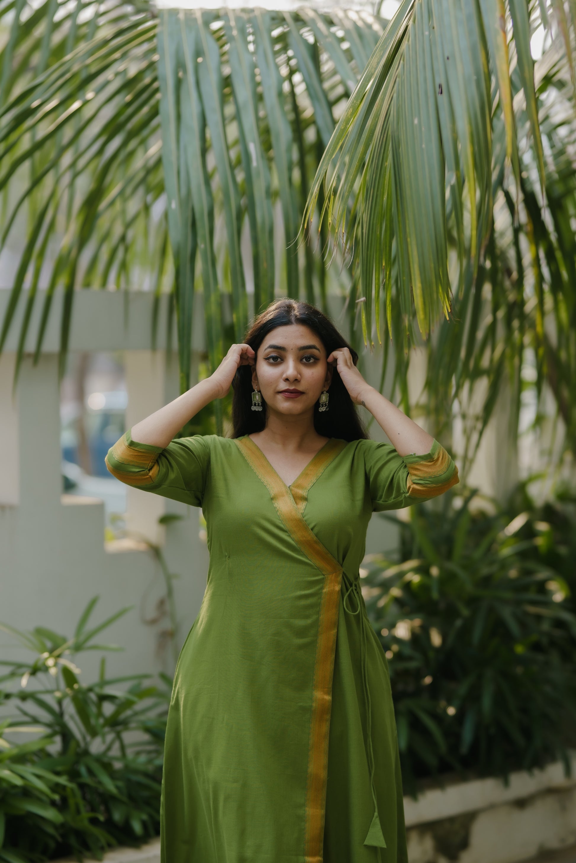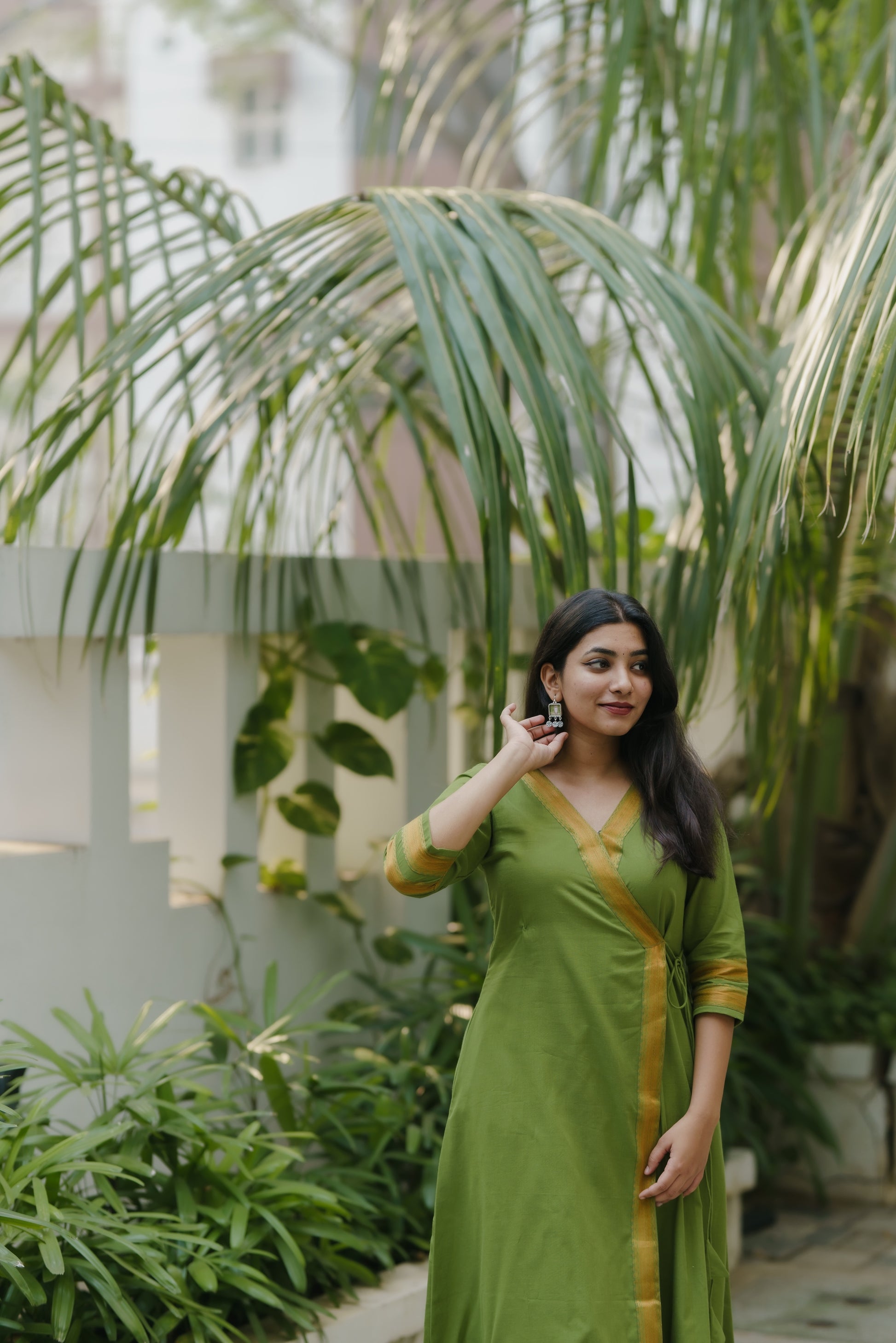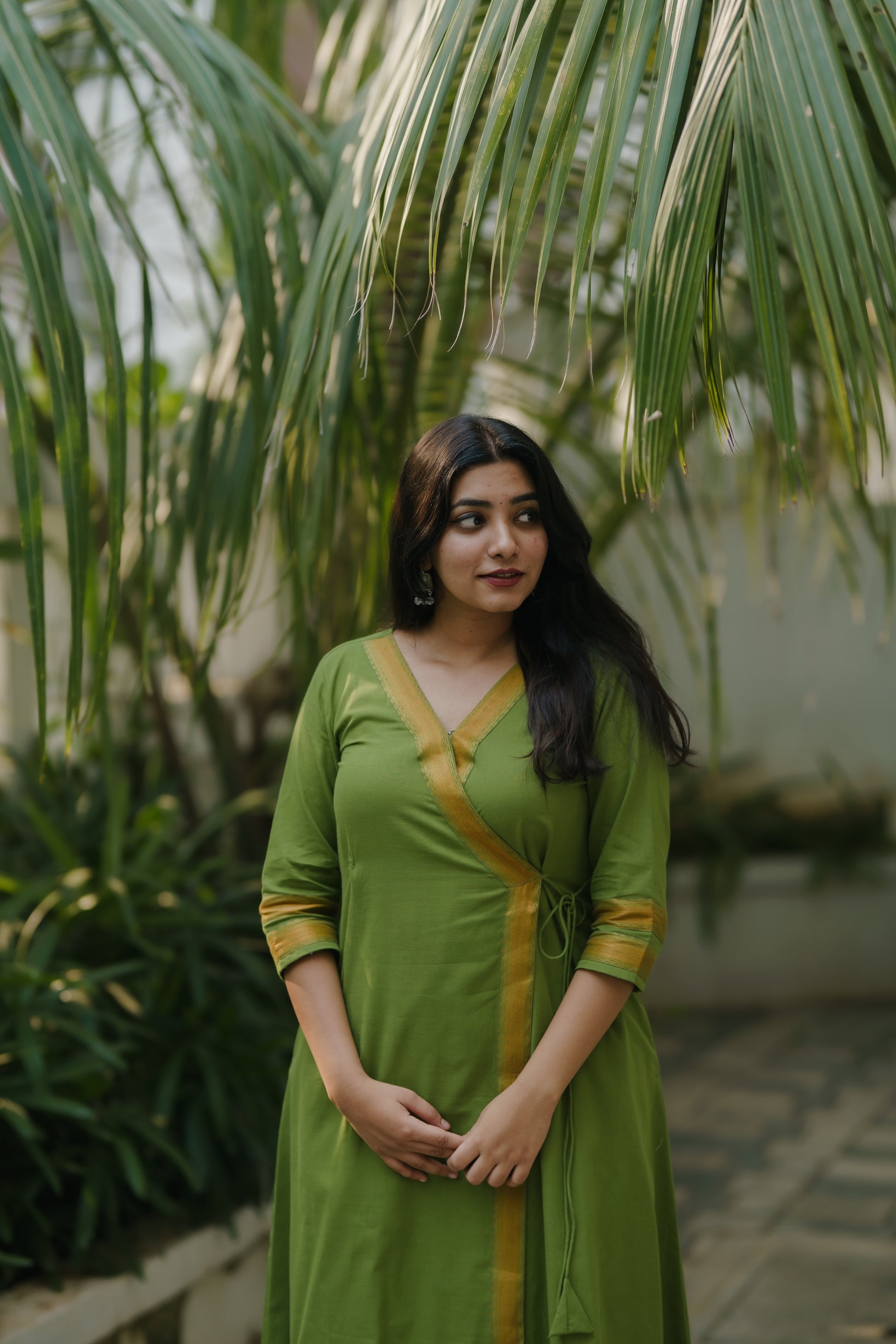 This beautiful leaf green Mangalagiri kurta set effortlessly blends tradition with a modern twist. Made from soft cotton, it features a wrap style kurta that is both comfortable and stylish. Elevate your wardrobe with this versatile and timeless piece.